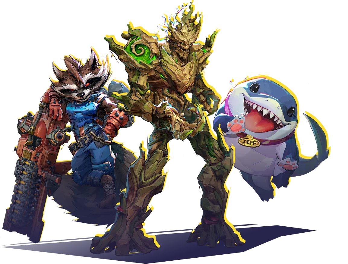 Jeff the Land Shark and Rocket Raccoon can ride on Groot's shoulders, receiving Damage Reduction.